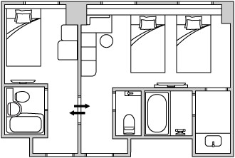 ファミリーやグループで使い勝手の良い、隣接したツインルームとシングルルームを、お部屋内にある内ドアでつないだコネクティングルームです。